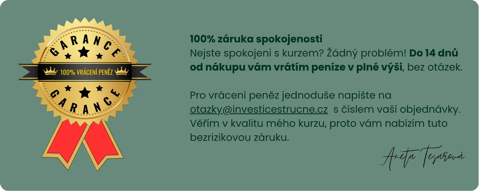 Pokud vám kurz nepřinese hodnotu, bez řeči vám do 14 dnů vrátím peníze. Investování do ETF není jen teorie – je to strategie, kterou využívají i penzijní fondy a nejbohatší investoři světa. Pokud nebudete spokojeni, dostanete své peníze zpět.